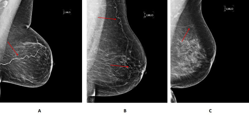 On a mammogram, BAC appears as thin, white lines tracing the path of breast arteries. These calcium streaks form in the middle layer of the artery wall, where they cause stiffness rather than blockage. Unlike plaque that clogs arteries, this type of calcification makes them less flexible.